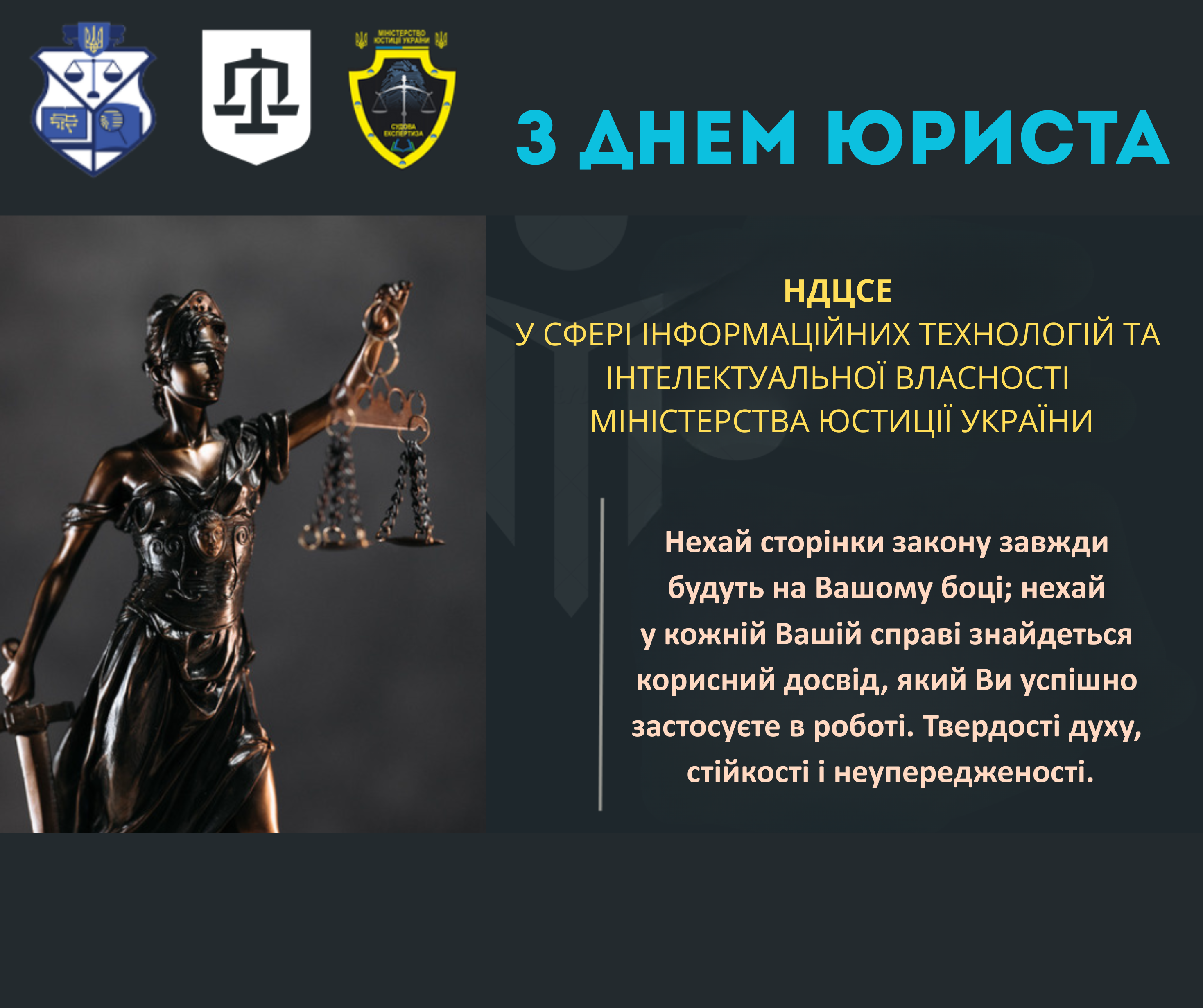 Наш НДЦСЕ У СФЕРІ ІНФОРМАЦІЙНИХ ТЕХНОЛОГІЙ ТА ІНТЕЛЕКТУАЛЬНОЇ ВЛАСНОСТІ МІНІСТЕРСТВА ЮСТИЦІЇ УКРАЇНИ вітає колег з професійним святом – Днем юриста! Бажаємо плідної роботи та подальших успіхів у зміцненні законності та правопорядку, міцного здоров’я, особистого щастя, родинного добробуту на довгі роки, мирного неба над головою та Перемоги!! Зі святом! Слава Україні!